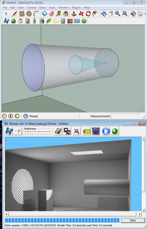 You can create the same effect using IRender nXt by placing a Spot Light or Point Light in a cylinder, and placing geometry or an alpha-transparent image on the face at the end of the cylinder.