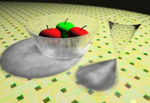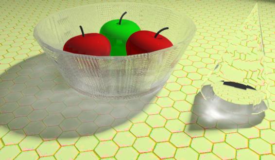This is a glass bowl of apples, (with a pyramid procedural bump effect), and a glass cone, rendered with transparency and refraction, and with Caustic effects. (Reflection 0.90, refraction 1.15).