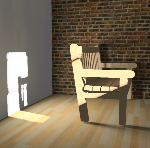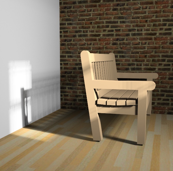 Small lamp placed in front of chair. 30 rendering passes. Note harsher shadows