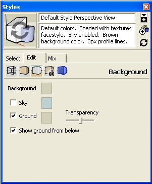 - The Ground Plane Settings for SketchUp are on the SketchUp Style window. It is actually kind of hard to get to because you have to click the model icon, click edit, and then select the proper tab.